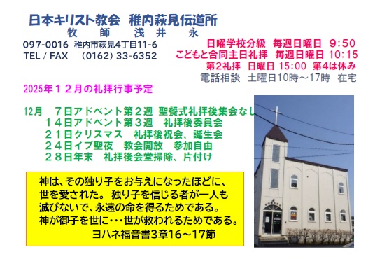 お仕事や旅行で日本最北の街「稚内市」へお越しで日曜日の礼拝を守りたい方がおりましたらお気軽に礼拝に参加をして下さい。共に主イエス・キリストへの礼拝と賛美を守ることが出来れば幸いです。